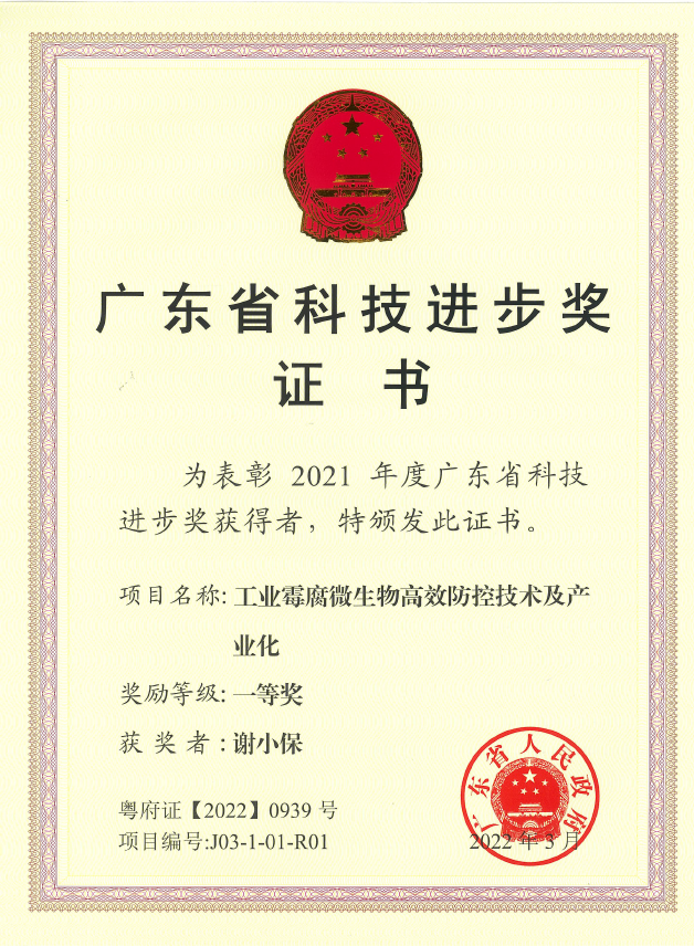k8凯发国际谢小保研究员作为主要完成人的“工业霉腐微生物高效防控技术及产业化”取得2021年度广东省科技进步一等奖。针对我国工业产品霉腐微生物危害严重、抗药性问题突出、缺乏工业霉腐微生物高效防控等技术瓶颈,项目团队历经近二十年的持续研究攻关,攻克了传统抗菌产品抗菌谱系窄、抗菌效果差、易产生耐药性等技术瓶颈,在防腐体系适应于不同基质产品中应用方面取得了重大突破,实现了大规模的产业化应用;建立了国内唯一的工业霉腐微生物专业菌种库,系统地阐明了纳米银、植物精油等多种抗菌剂的抗菌机理,创建了微生物抗药机理的“三道防线理论”;研究制订了工业产品抗微生物效能测试方法系列标准,创建了包括木塑、涂料和日化等行业的高效精准防控技术体系,为解决霉腐微生物危害给予了关键技术支撑,有助于了工业霉腐微生物防控技术的开展。相关专利、标准和产品已在国内近千家企业应用,近三年新增销售收入341.64亿元,创利85.46亿元。项目成果整体达同类研究国际先进水平,抗微生物性能指标达到国际领先水平。